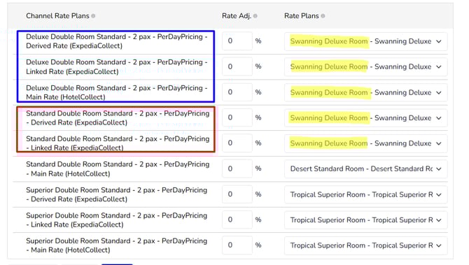 Hotel Link rate plan (Swanning Deluxe Room) is mapped with two different OTA rate plans: Deluxe Double Room Standard - 2 pax - PerDayPricing and Standard Double Room Standard - 2 pax - PerDayPricing. This is considered as incorrect OTA mapping and can lead to overbooking case.