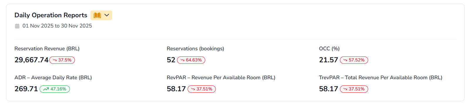 A comprehensive overview of daily performance, including Revenue, Room Nights Sold, Occupancy Rate, ADR, and RevPAR, providing valuable insights into your property’s operational efficiency and profitability.