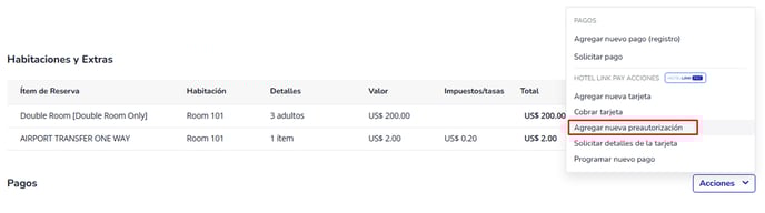 Agregar una nueva autorización previa permite al alojamiento retener un monto en la tarjeta del huésped para garantizar el pago de su estadía o en caso de “no show”. Siga los pasos a continuación para crearla.