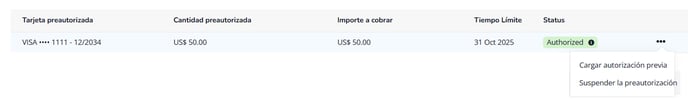 El campo de monto muestra el total preautorizado (editable solo a un valor menor).