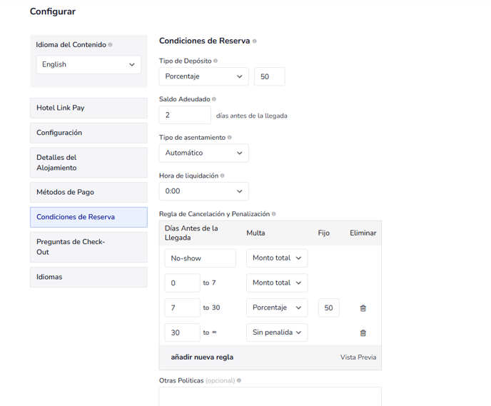 Regla y Tarifa de Cancelación: Esta opción te permite especificar las reglas y penalidades de cancelación para tus reservas. Es obligatorio que cada propiedad tenga políticas de no show y cancelación. Puedes previsualizar el resultado en vivo de la política de cancelación pasando el cursor sobre la etiqueta "Vista Previa". Esta vista previa muestra la misma política que se presenta al viajero durante el proceso de reserva, en el voucher y en el correo electrónico de notificación de reserva.