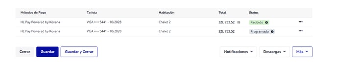 La primera línea, con el estado Recibido, indica que el depósito fue recibido en el momento de la reserva. Como su configuración de depósito es del 50%, el sistema cobrará la tarjeta del huésped al momento de la reserva.