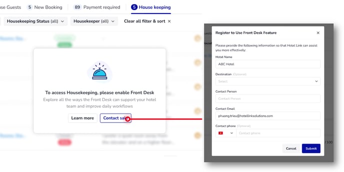 In case you are not using the Front Desk module, the screen below will be displayed. If you want to enable this feature, click 'Contact sales'. After that, provide the necessary information and click 'Submit'.