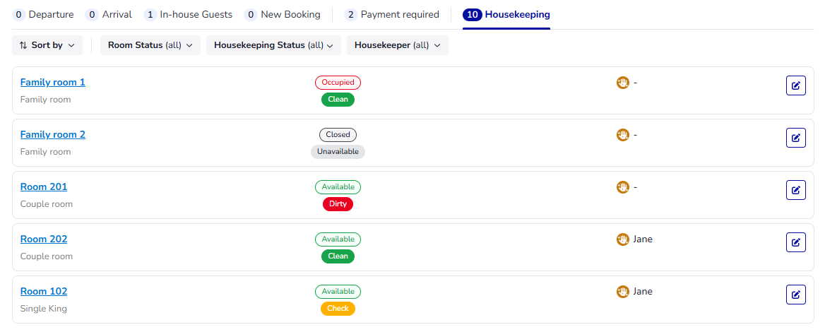 The Housekeeping tab gives you a complete overview of your property’s cleaning status. It shows which rooms are ready, which are being cleaned, and which still require attention.