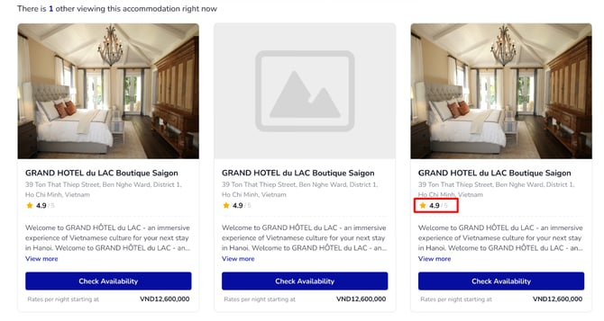 - Show hotel rating: Define if you wish to show a rating display for each hotel in the group. This rating is based on the rating configured for each hotel in Accommodation Setup page.