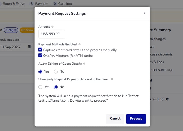 - Process the Request: Click the 'Process' button to send the payment request. The guest will receive an email with a link to complete their payment.