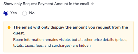 - Show only Request Payment Amount in the email: Define if you want to display only the amount you request from the guest or include the total booking payment information. If you select 'Yes', room information remains visible, but all other price details (prices, totals, taxes, fees, and surcharges) are hidden.