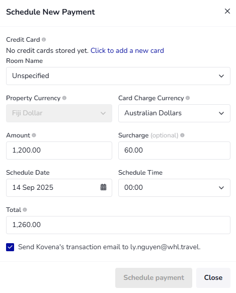 - Surcharge (optional): The surcharge to receive the payment. The default amount on this field is calculated based on the surcharge defined in the Booking Engine > Payment Methods. You can adjust this surcharge amount.