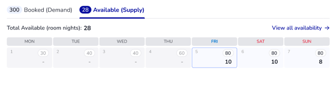 Available (Supply) (Sellable rooms × Nights): Number of available room nights (excluding blocked, closed, or out-of-allotment rooms) within the selected date range.