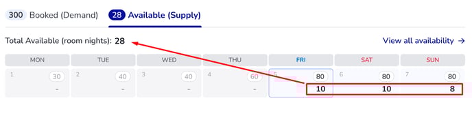 {2} shows the total room nights available of all room types for that date. The total room nights available of all room types for today and all future dates will be shown on top of the chart:
