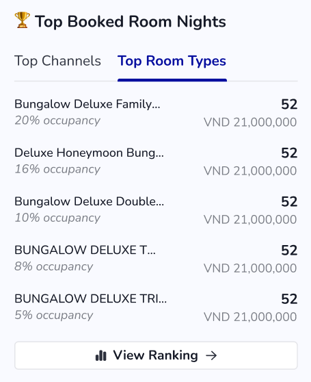 - For example: Bungalow Deluxe Family room is the top room type with 52 room nights booked. This room has the OCC is 20% and generates a total revenue of 21,000,000 VND.