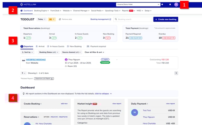 A table to summarize your daily operations tasks. You can easily manage check-in and check-out bookings and charge bookings. For more details, click here.