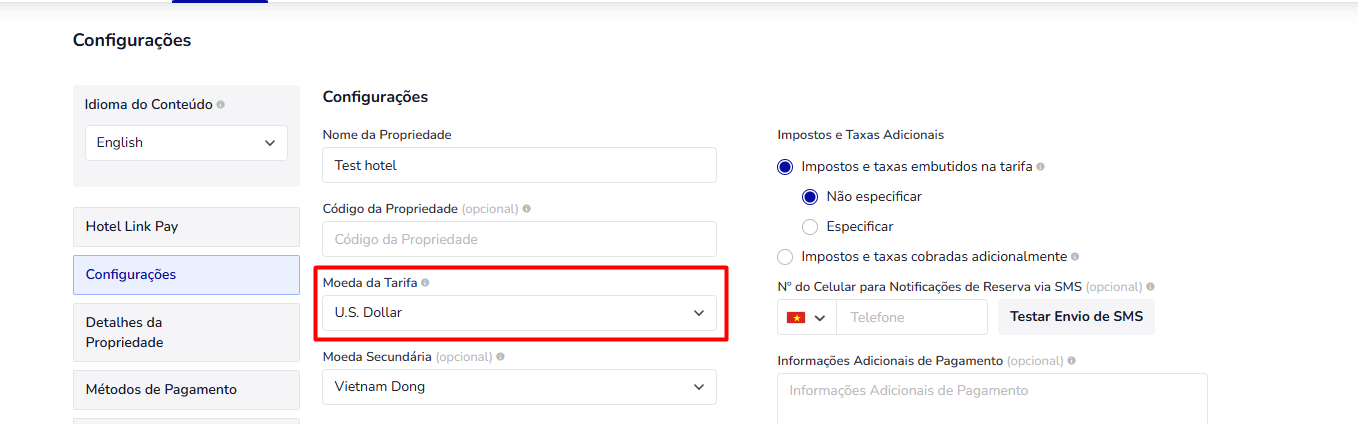 A moeda definida no Motor de Reservas será a mesma utilizada para as tarifas de quartos inseridas na página de Tarifas e Disponibilidade.
