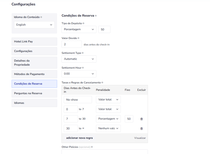 - Por exemplo: Depósito = 50%, saldo devido = 2 dias antes da chegada, tipo de liquidação = automático: