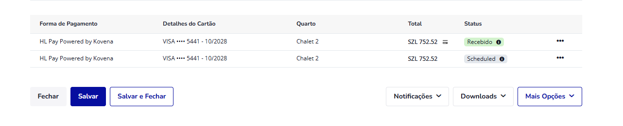 A primeira linha, com o status Received, indica que o depósito foi recebido no momento da reserva. Como sua configuração de depósito é 50%, o sistema cobrará o cartão do hóspede no momento da reserva.