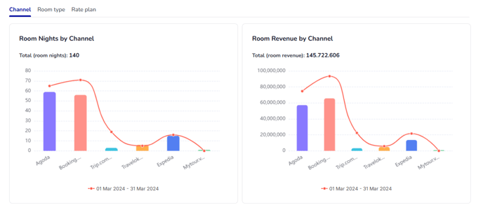 Bằng cách so sánh các chỉ số này, người dùng có thể nhận diện các kênh hiệu suất cao, theo dõi phân bổ doanh thu và đánh giá hiệu quả các nguồn đặt phòng khác nhau theo thời gian. Dữ liệu này hỗ trợ việc quản lý kênh và chiến lược giá tốt hơn để tối đa hóa doanh thu.