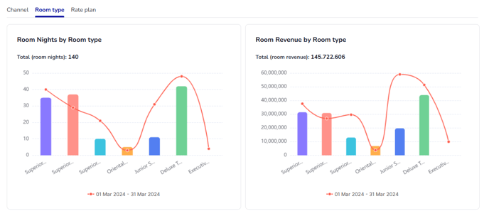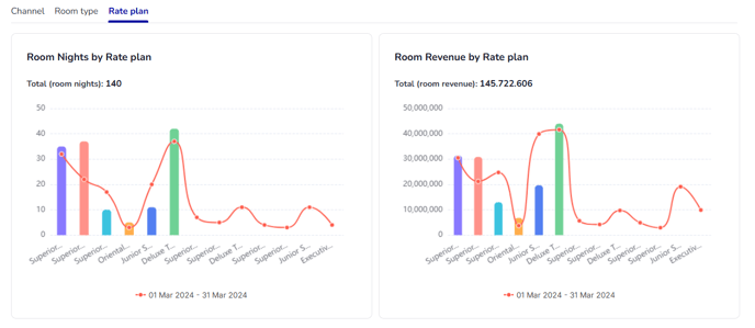 Gói giá (Rate plan): Biểu đồ này cung cấp phân tích số đêm phòng đã đặt và doanh thu theo gói giá. Biểu đồ bên trái (Room Nights by Rate plan) hiển thị tổng số đêm phòng đã đặt theo các gói giá khác nhau, trong khi biểu đồ bên phải (Room Revenue by Rate plan) cho thấy doanh thu phòng theo từng hạng gói giá.