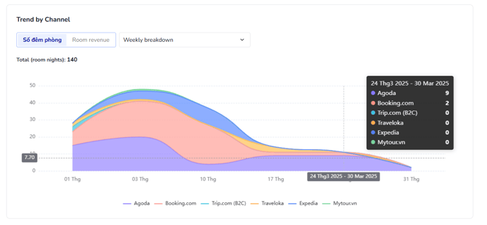 - Số đêm theo giai đoạn: Phân bổ doanh thu theo từng đêm cụ thể trong khoảng thời gian đã chọn.