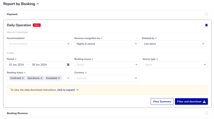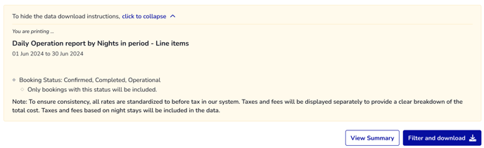 Phần này cung cấp tóm tắt rõ ràng về các bộ lọc và cài đặt đã áp dụng cho báo cáo, giúp người dùng kiểm tra dữ liệu được bao gồm trước khi tải xuống. Nó đảm bảo khoảng thời gian đã chọn, nguồn đặt phòng, trạng thái và tiền tệ là chính xác.