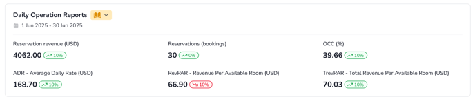 Phần này trình bày tổng quan về các chỉ số vận hành chính của cơ sở lưu trú trong khoảng thời gian đã chọn. Nó làm nổi bật hiệu suất qua các chỉ số cốt lõi như: tổng doanh thu đặt phòng, số lượng đặt phòng, tỷ lệ lấp đầy (OCC), ADR, RevPAR và TrevPAR. Nó bao gồm số liệu hiện tại và phần trăm thay đổi so với kỳ trước.