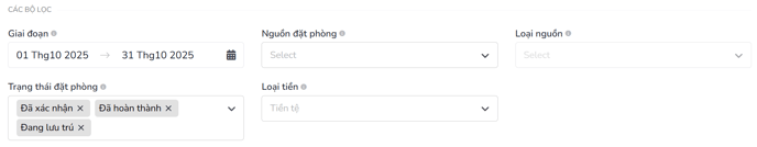 Trạng thái đặt phòng: Lọc đặt phòng theo trạng thái hiện tại, bao gồm: Đã xác nhận, Đang lưu trú, Đã hoàn thành, Đã hủy, Đã hủy và bị phạt, Không đến, Không đến và bị phạt.