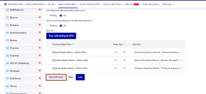 Khi chỉ vô hiệu hóa kết nối, liên kết vẫn sẽ được giữ lại, cho phép bạn kích hoạt lại kết nối OTA trong tương lai. Trong khi đó, nút Xóa sẽ loại bỏ liên kết giữa các gói giá trên OTA và trên Extranet của Hotel Link.