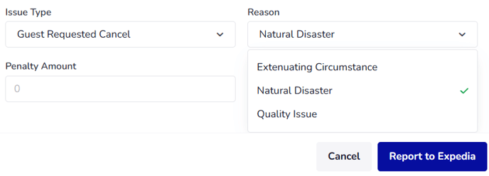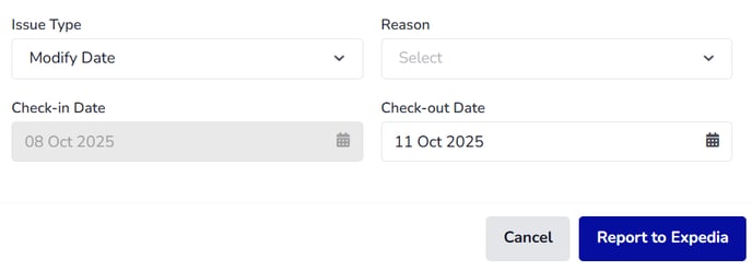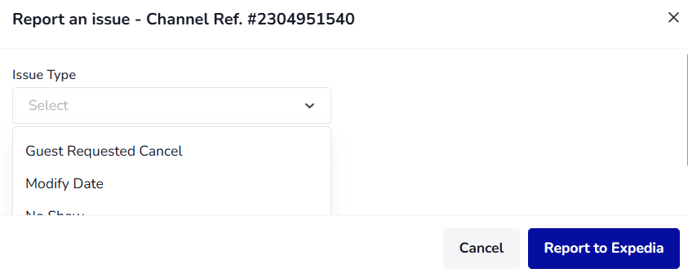 Với các đặt phòng sau ngày nhận phòng, khách sạn có thể báo cáo sự cố cho Expedia. Tùy theo loại đặt phòng, các tùy chọn khác nhau sẽ xuất hiện: