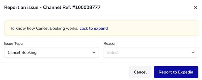 Khi một đặt phòng đã được báo cáo thành công cho Expedia, bạn sẽ không thể báo cáo lại lần nữa. Một cửa sổ thông báo sẽ xuất hiện nếu bạn cố chọn “Báo cáo sự cố”.