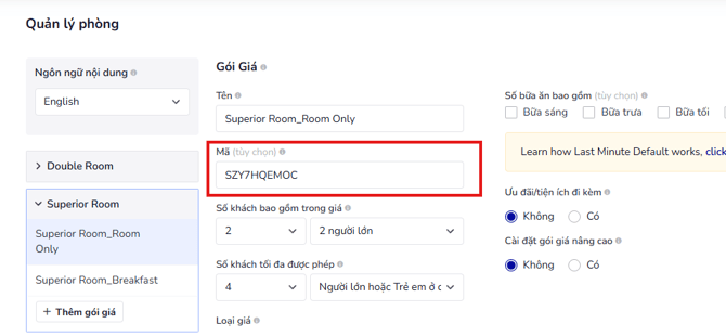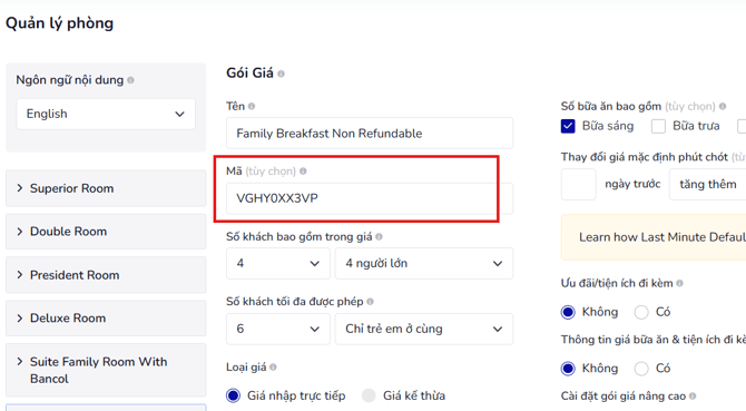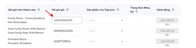Trường hợp 1: Gói giá đã có mã gói giá: Nếu trong Công cụ đặt phòng > Quản lý Phòng > Trang gói giá > Trường Mã gói giá đã có mã, hệ thống sẽ dùng mã đó để tạo dữ liệu trên Trip.com.