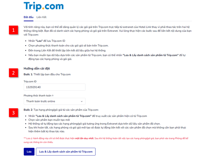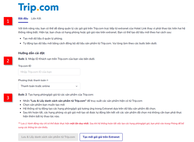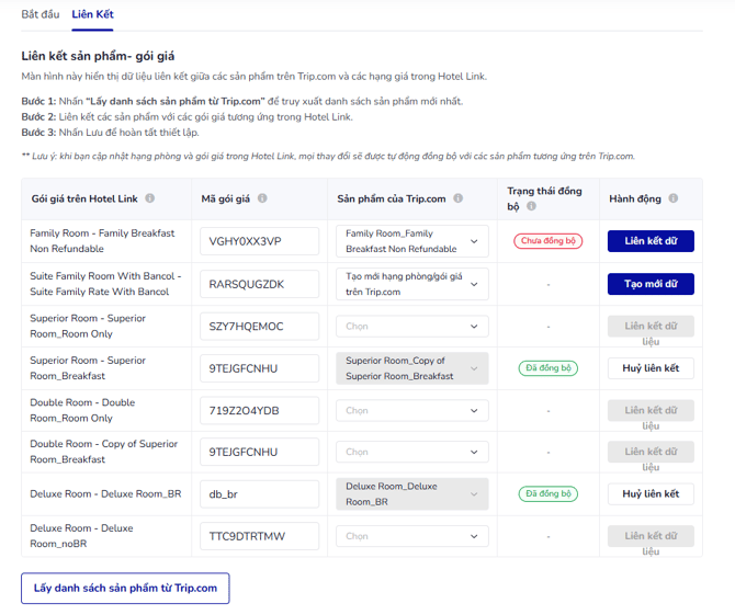 - Đọc hướng dẫn trong mục này để tạo phòng/gói giá từ danh sách sản phẩm Trip.com.