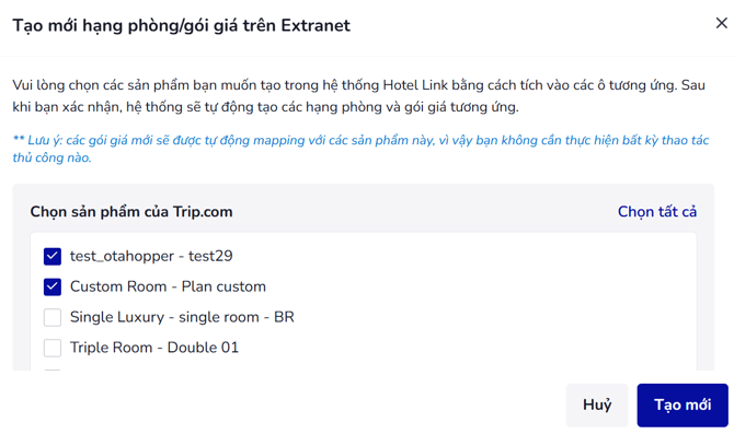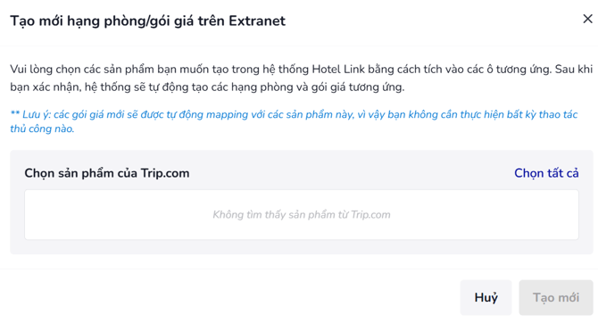 Lưu & lấy danh sách sản phẩm từ Trip.com: Nút này dùng để lưu ID tài khoản Trip.com, sau đó truy xuất danh sách sản phẩm hiện có từ Trip.com. Tiếp theo sẽ có cửa sổ bật lên cho phép bạn chọn sản phẩm muốn tạo phòng hoặc gói giá. Nhấp “Tạo mới” để hệ thống tạo phòng/gói giá tương ứng trên extranet.