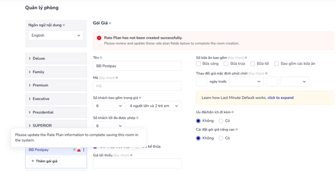 Sau khi hệ thống tạo xong phòng/gói giá, bạn phải vào trang Quản lý phòng bằng cách nhấp “Đi tới thiết lập phòng” trong cửa sổ thông báo để bổ sung các thông tin còn thiếu.