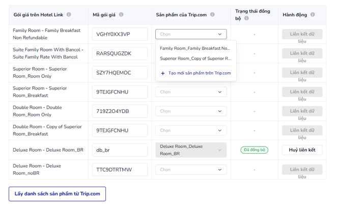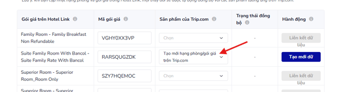 Trạng thái Hành động Bạn cần làm Chưa đồng bộ Liên kết dữ liệu Nhấp “Liên kết dữ liệu” để kết nối gói giá của bạn với sản phẩm Trip.com đã chọn. Sau đó trạng thái sẽ chuyển sang “Đã đồng bộ”. Đã đồng bộ Hủy liên kết Nhấp “Hủy liên kết dữ liệu” nếu bạn muốn gỡ liên kết hiện tại giữa gói giá của bạn và sản phẩm Trip.com. Sau đó trạng thái sẽ chuyển thành “-”. - Tạo mới dữ liệu 1. Chọn “Tạo mới hạng phòng/gói giá trên Trip.com” trong danh sách sản phẩm Trip.com.