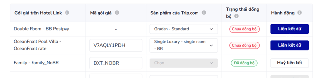 - Sau khi phòng và gói giá được tạo thành công, hệ thống sẽ tự động liên kết sản phẩm Trip.com với gói giá Hotel Link tương ứng trong tab Kết nối.