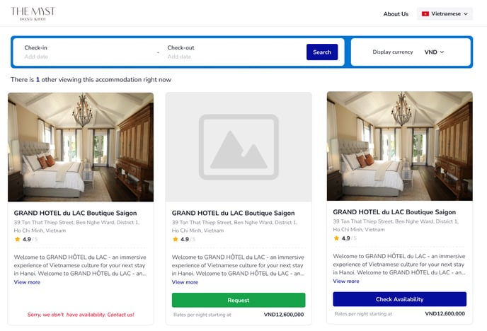 Khi bạn nhấp vào nút “Check Availability (kiểm tra phòng trống)” hoặc “Request (Yêu cầu)”, hệ thống sẽ chuyển hướng đến tiện ích đặt phòng của khách sạn tương ứng. Ngoài ra, mỗi khách sạn trong nhóm cũng sẽ hiển thị điểm đánh giá của khách sạn đó.