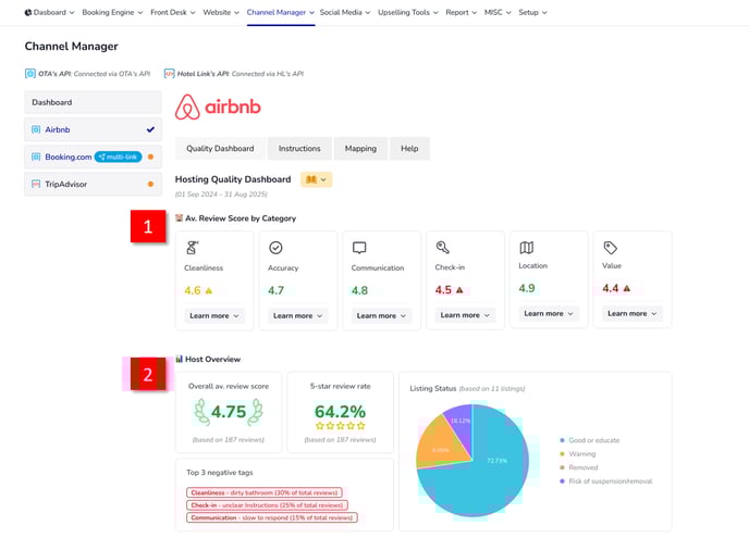 Truy cập vào Trình quản lý kênh, trong danh sách OTA, nhấp vào Airbnb > chọn tab bảng điều khiển chất lượng.