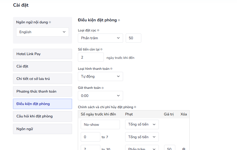 Đây là nơi bạn có thể thiết lập chính sách hủy và các hình phạt ở mức độ tổng thể (áp dụng cho tất cả các gói giá). Để thiết lập các điều kiện đặt phòng chung: